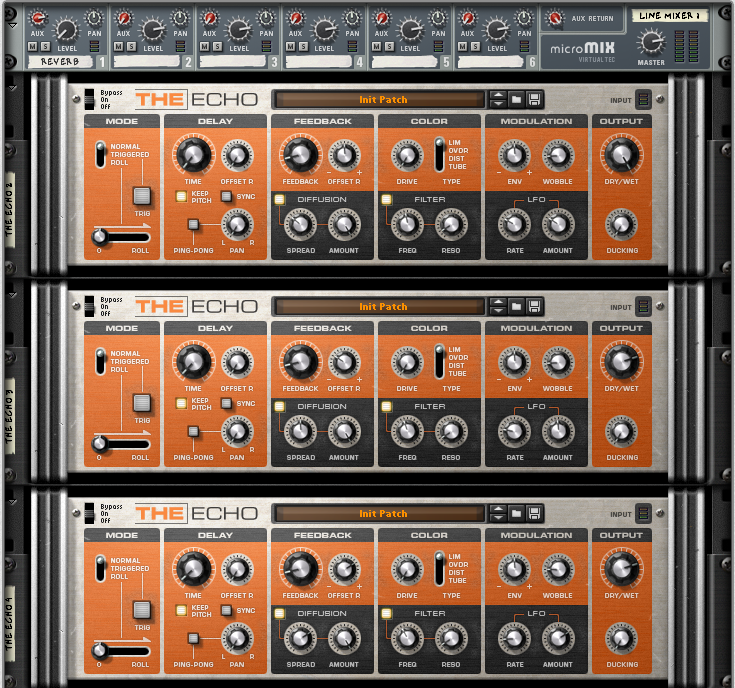- Insert 3 Instances of The Echo (modulating delay)