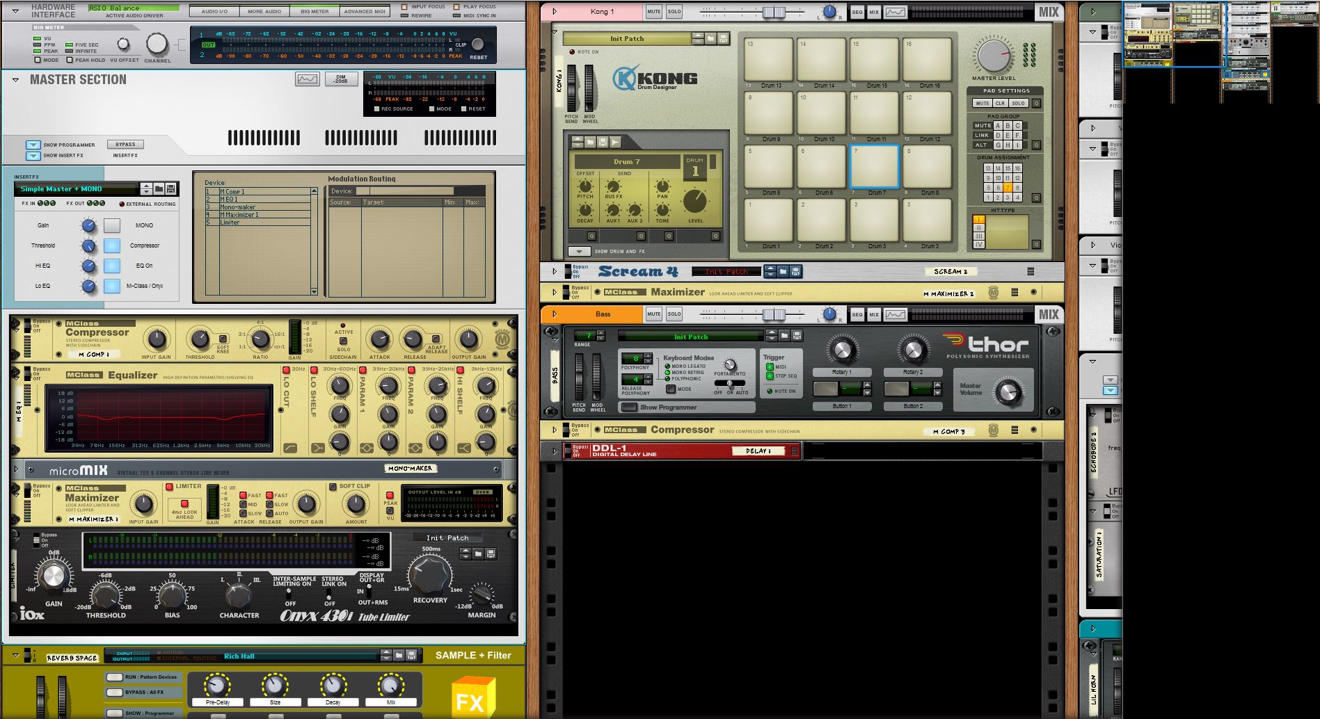 - Rack 1: (far left) Global units. The Masters (my usual rig) are already there. The only other things I have here are things like Send Effects