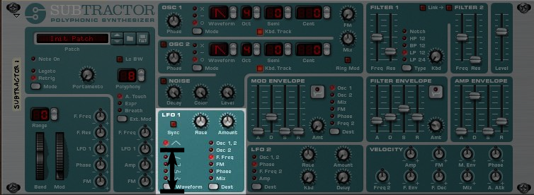 We decide how much of that modulation (movement) we want to send to the Filter Cutoff by setting the Amount knob to 25%: