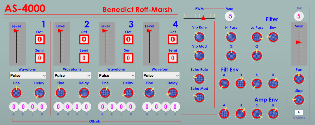 Delaying the Oscilators also allows for a kind of Strum effect as each osc plays back one after the other. Nice for electric piano or ostinato effects. With slow envelopes (incl by using Env Offsets), this can be used to make more moving or evolving pads.