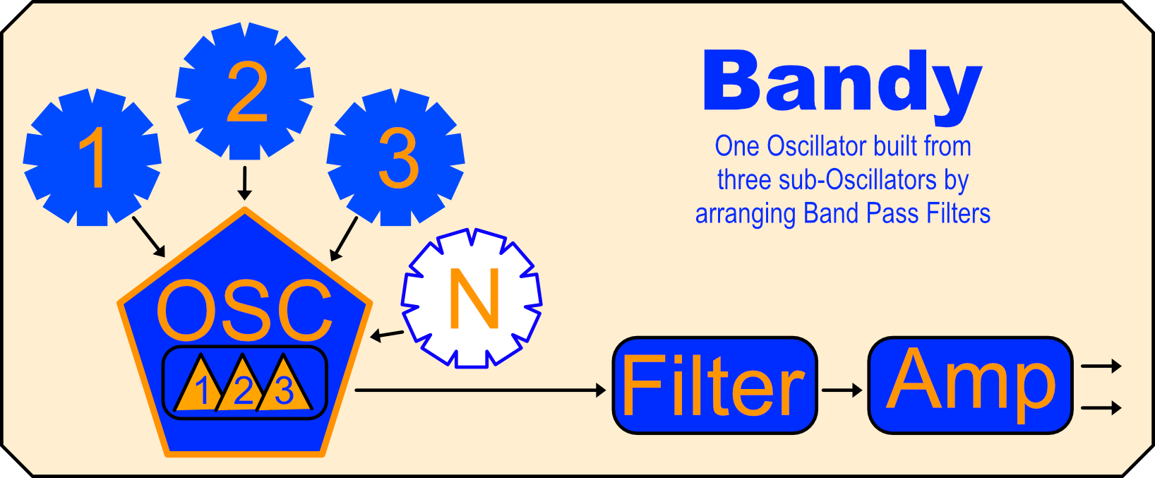 Bandy is a different approach to the Oscillator. Bandy has what is essentially one Oscillator built from three sub-Oscillators; each sub-osc adding a part of the spectrum to form the sound.